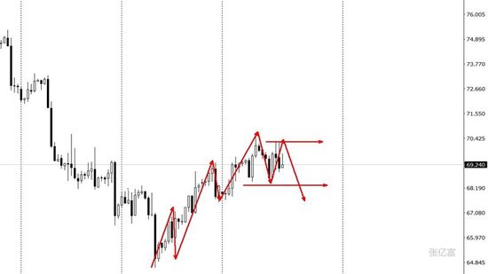 原油市场昨日开盘在70.19美元/桶,后行情直接拉升,日线最高触及到了72.58美元/桶,后行情冲高回落,日线最终收线在了72.22美元/桶,后行情以一根上影线较长的光脚大阳线收线,而这样的形态收尾后,原油延续多头震荡中。4小时图触及下行趋势线附近受压回落,从反弹空间来看还是比较大,将此前的弱势转为震荡走法,今日留意昨日高点72.50压制。多头趋势线的关键防守在69.5,只要后市不下破69.4,后市多头依旧有望抬头。综合以上分析,原油处于探底回升阶段,目前运行一个小区间支撑,操作上考虑回撤布局多单为先,高空为辅,上方关注72.5-73.5美元阻力,下方关注70.0-69.5美元支撑。